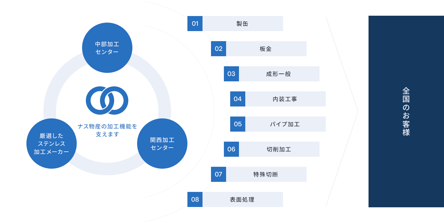 製缶・板金・内装工事・成形・パイプ加工など、全国のお客様の多様なニーズに柔軟に対応します。